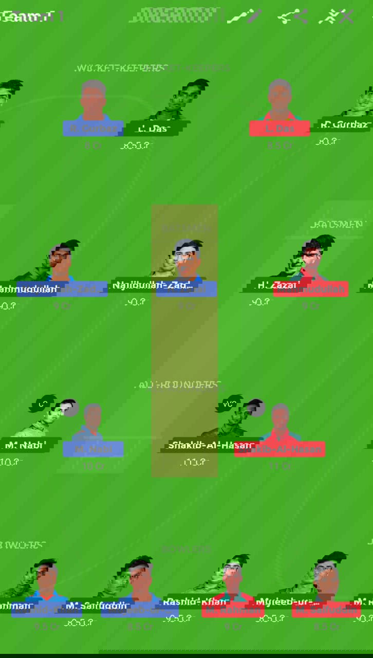 Bowlers: Rashid-Khan,Mujeeb Ur Rahman,, M Rahman, M Saifuddin Captain & Vice-captain: M Nabi, Shakib Al Hasan Wicket Keepers: R Gurbaz,L Das