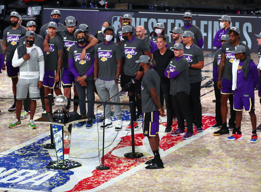 Sep 26, 2020; Lake Buena Vista, Florida, USA; Los Angeles Lakers forward LeBron James (23) speaks after defeating the Denver Nuggets game five of the Western Conference Finals of the 2020 NBA Playoffs at AdventHealth Arena. Mandatory Credit: Kim Klement-USA TODAY Sports