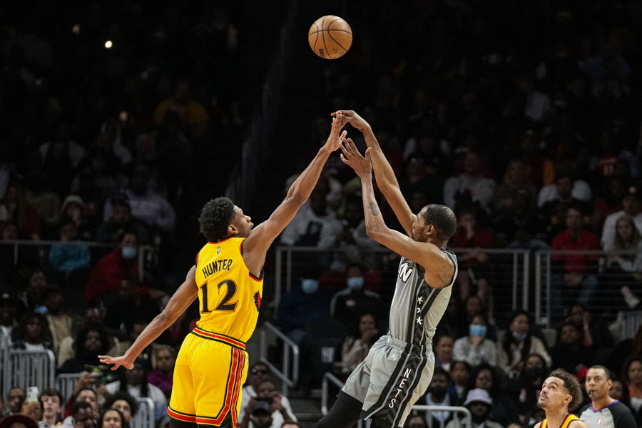 Apr 2, 2022; Atlanta, Georgia, USA; Brooklyn Nets forward Kevin Durant (7) scores over top of Atlanta Hawks forward De’Andre Hunter (12) during the second half at State Farm Arena. Mandatory Credit: Dale Zanine-USA TODAY Sports