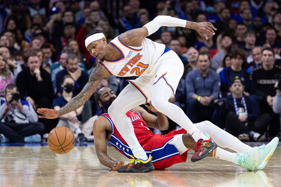 Mar 2, 2022; Philadelphia, Pennsylvania, USA; New York Knicks forward Cam Reddish (21) chases a loose ball past Philadelphia 76ers guard James Harden (1) during the fourth quarter at Wells Fargo Center. Mandatory Credit: Bill Streicher-USA TODAY Sports