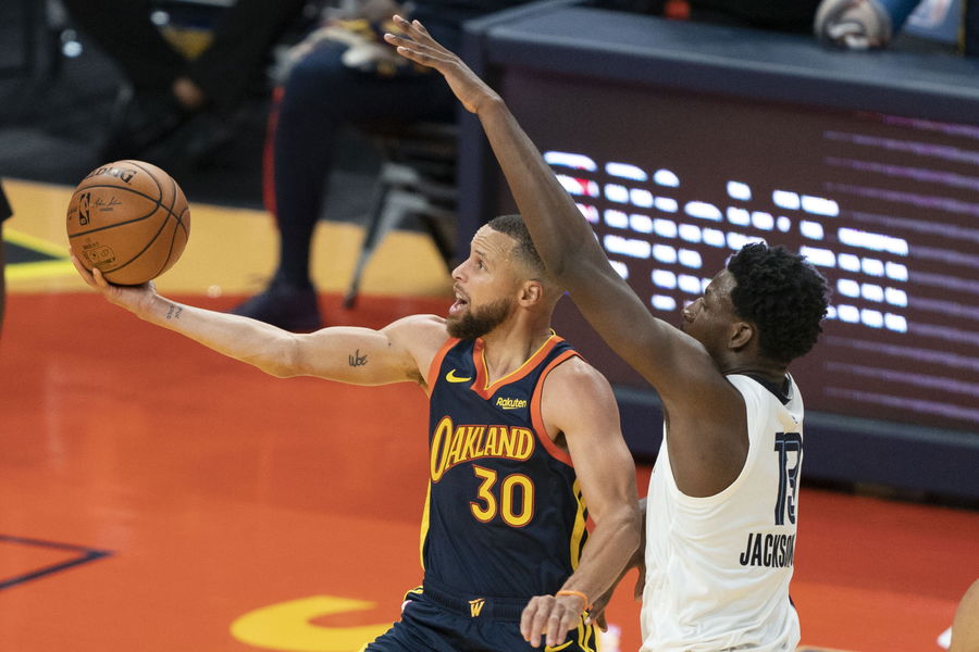 May 21, 2021; San Francisco, CA, USA; Golden State Warriors guard Stephen Curry (30) shoots the basketball against Memphis Grizzlies forward Jaren Jackson Jr. (13) during the third quarter at Chase Center. Mandatory Credit: Kyle Terada-USA TODAY Sports