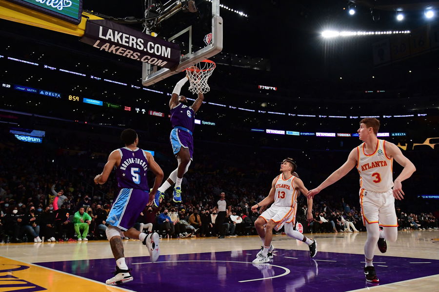 Jan 7, 2022; Los Angeles, California, USA; Los Angeles Lakers forward LeBron James (6) dunks for a basket in front of Atlanta Hawks guard Bogdan Bogdanovic (13) and guard Kevin Huerter (3) during the second half at Crypto.com Arena. Mandatory Credit: Gary A. Vasquez-USA TODAY Sports