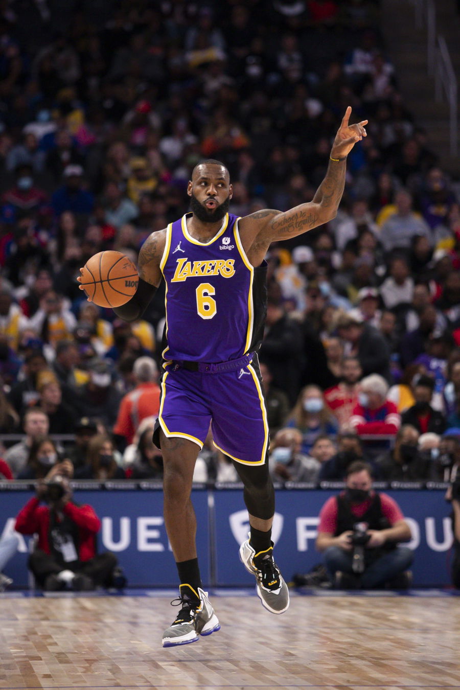 Nov 21, 2021; Detroit, Michigan, USA; Los Angeles Lakers forward LeBron James (6) calls out a play while dribbling the ball up the court during the second quarter against the Detroit Pistons at Little Caesars Arena. Mandatory Credit: Raj Mehta-USA TODAY Sports