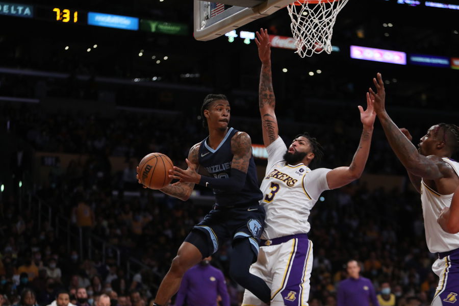 Oct 24, 2021; Los Angeles, California, USA; Memphis Grizzlies guard Ja Morant (12) looking to pass against Los Angeles Lakers forward Anthony Davis (3) during the second quarter at Staples Center. Mandatory Credit: Kiyoshi Mio-USA TODAY Sports