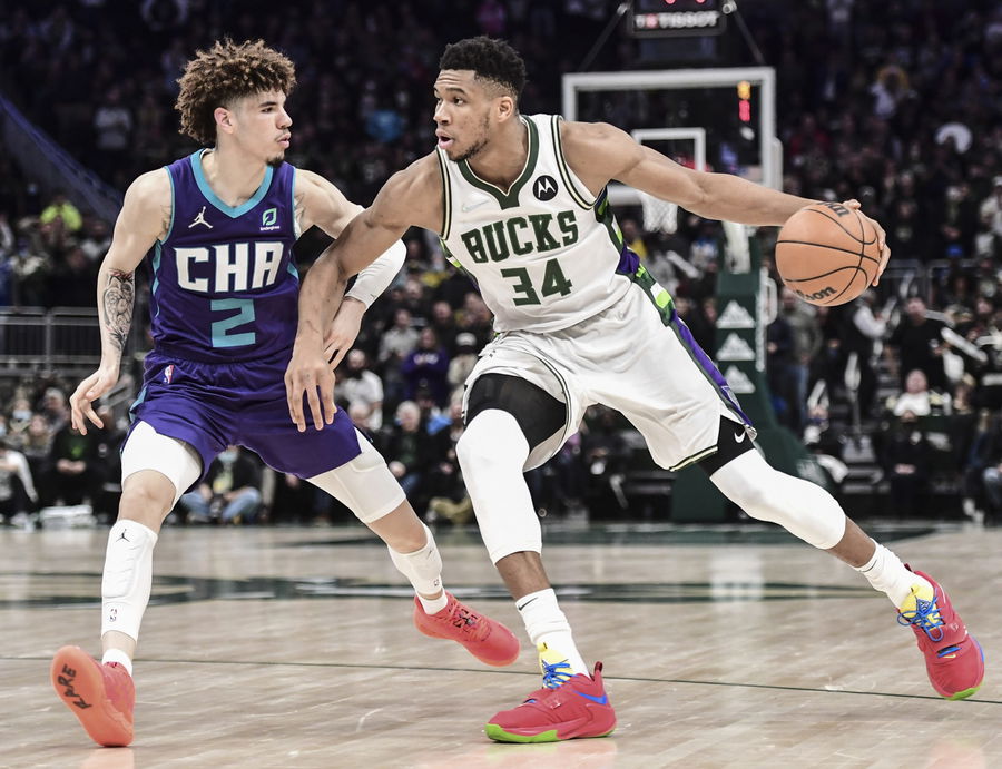 Dec 1, 2021; Milwaukee, Wisconsin, USA; Milwaukee Bucks forward Giannis Antetokounmpo (34) drives for the basket against Charlotte Hornets guard LaMelo Ball (2) in the fourth quarter at Fiserv Forum. Mandatory Credit: Benny Sieu-USA TODAY Sports