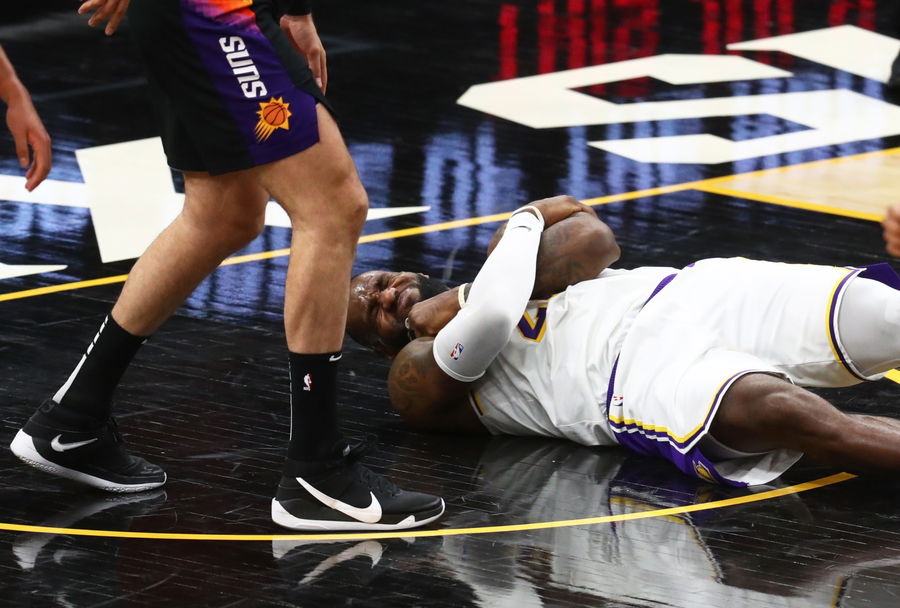 May 23, 2021; Phoenix, Arizona, USA; Los Angeles Lakers forward LeBron James reacts after suffering an injury against the Phoenix Suns in the second half during game one in the first round of the 2021 NBA Playoffs at Phoenix Suns Arena. Mandatory Credit: Mark J. Rebilas-USA TODAY Sports