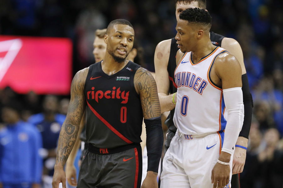 Jan 22, 2019; Oklahoma City, OK, USA; Portland Trail Blazers guard Damian Lillard, left, and Oklahoma City Thunder guard Russell Westbrook, right, have a conversation following the end a game at Chesapeake Energy Arena. Oklahoma City won 123-114. Mandatory Credit: Alonzo Adams-USA TODAY Sports
