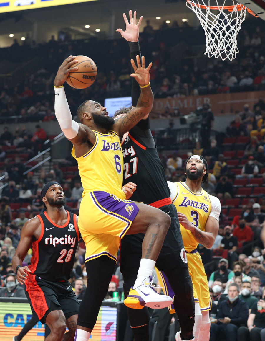 Feb 9, 2022; Portland, Oregon, USA; Los Angeles Lakers forward LeBron James (6) shoots over Portland Trail Blazers center Jusuf Nurkic (27) in the first half at Moda Center. Mandatory Credit: Jaime Valdez-USA TODAY Sports