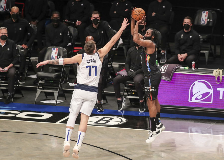 Feb 27, 2021; Brooklyn, New York, USA; Brooklyn Nets guard James Harden (13) takes a three point shot in the first quarter against the Dallas Mavericks at Barclays Center. Mandatory Credit: Wendell Cruz-USA TODAY Sports