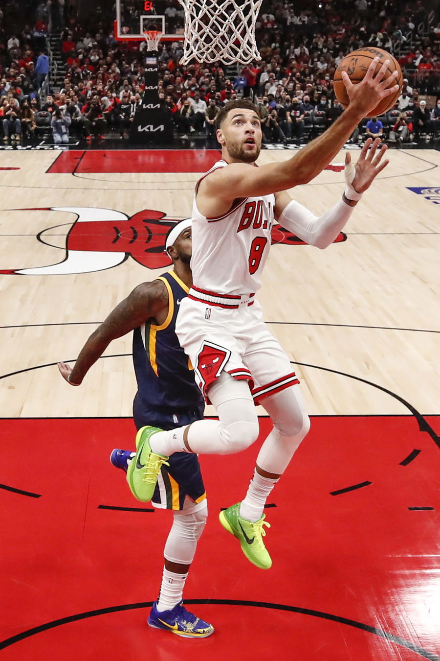 Oct 30, 2021; Chicago, Illinois, USA; Chicago Bulls guard Zach LaVine (8) goes to the basket against the Utah Jazz during the first half at United Center. Mandatory Credit: Kamil Krzaczynski-USA TODAY Sports