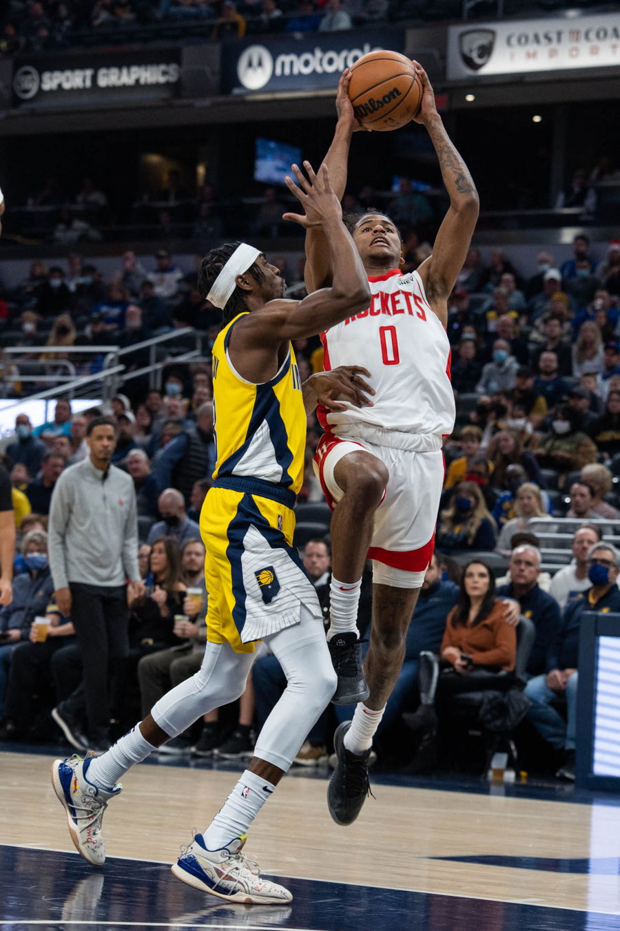 Dec 23, 2021; Indianapolis, Indiana, USA; Houston Rockets guard Jalen Green (0) shoots the ball while Indiana Pacers forward Justin Holiday (8) defends in the first quarter at Gainbridge Fieldhouse. Mandatory Credit: Trevor Ruszkowski-USA TODAY Sports