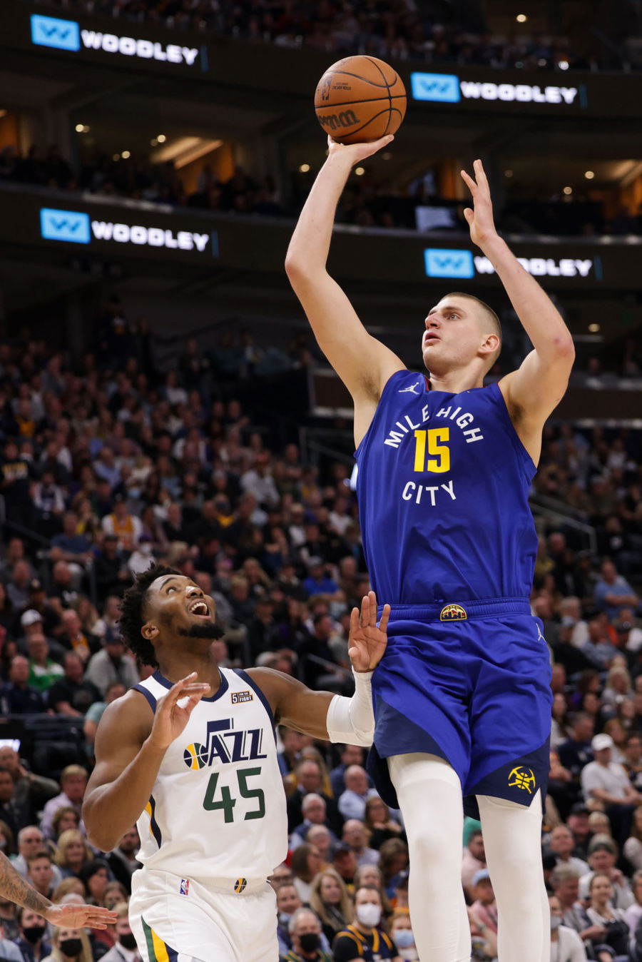 Oct 26, 2021; Salt Lake City, Utah, USA; Denver Nuggets center Nikola Jokic (15) shoots the ball over Utah Jazz guard Donovan Mitchell (45) during the second quarter at Vivint Arena. Mandatory Credit: Chris Nicoll-USA TODAY Sports