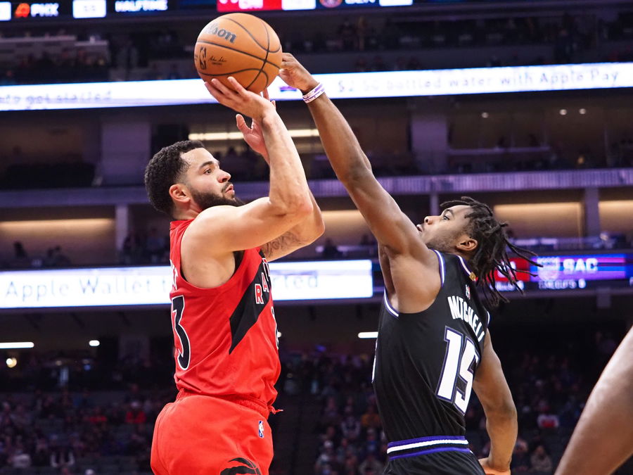 Nov 19, 2021; Sacramento, California, USA; Toronto Raptors guard Fred VanVleet (23) scores a basket in the final second of the first half against Sacramento Kings guard Davion Mitchell (15) at Golden 1 Center. Mandatory Credit: Kelley L Cox-USA TODAY Sports