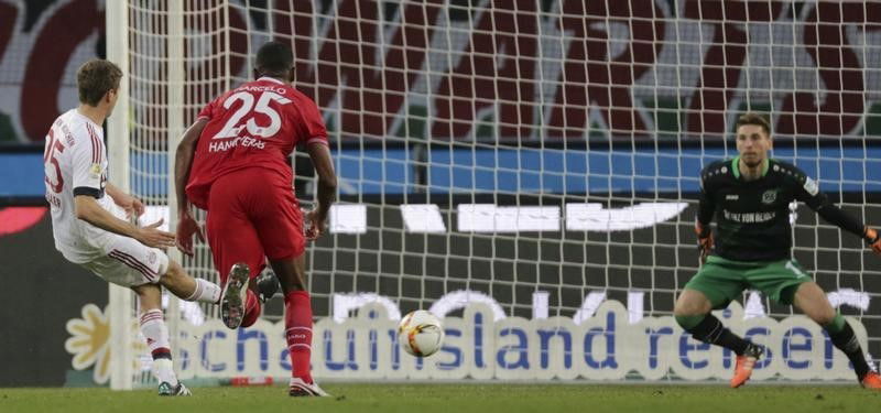 Football Soccer – Hanover 96 v Bayern Munich – German Bundesliga – HDI Arena, Hanover, Germany- 19/12/15 Bayern Munich’s Thomas Mueller scores the first goal past Hanover 96’s goalkeeper Ron-Robert Zieler. REUTERS/Fabian Bimmer
