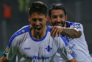 Darmstadt’s Sandro Wagner (L) celebrates his goal against Hannover 96 with team mate Aytac Sulu during their German Cup (DFB-Pokal) soccer match in Darmstadt, Germany October 27, 2015. REUTERS/Kai Pfaffenbach
