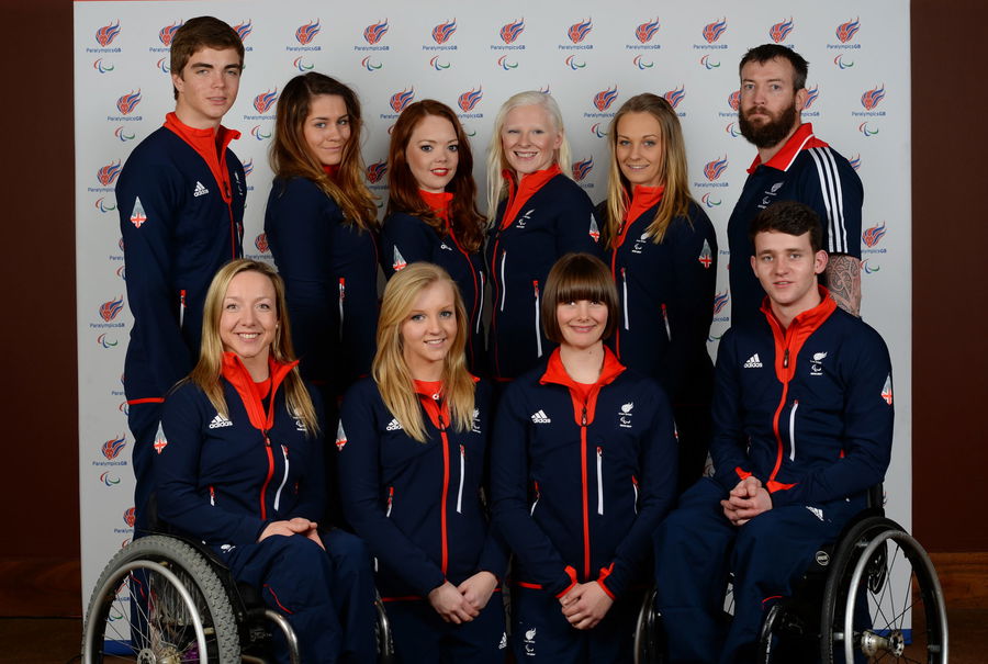 GLASGOW, SCOTLAND – JANUARY 23 : Alpine Skiing team back left to right James Whitley, Caroline Powell (Guide to Jade Etherington), Jade Etherington, Kelly Gallagher, Charlotte Evans (Guide to Kelly Gallagher) and Mick Brenna. With front left to right Anna Turney, Rachael Ferrier (Guide to Millie Knight), Millie Knight and Ben Sneesby, pose for a picture during the Paralympic Team GB Launch for Sochi at the Radisson Blu Hotel, Glasgowat the Radisson Blue hotel on January 23, 2014 in Glasgow, Scotland. (Photo by Mark Runnacles/Getty Images)