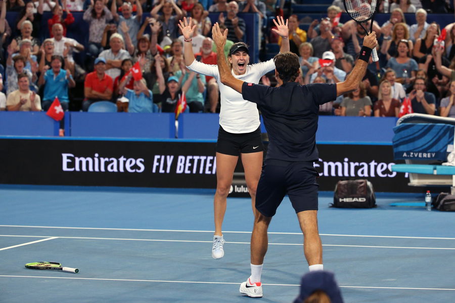PERTH, AUSTRALIA – JANUARY 05: Roger Federer and Belinda Bencic of Switzerland celebrate winning the Hopman Cup final against Alexander Zverev and Angelique Kerber of Germany on day eight of the 2019 Hopman Cup at RAC Arena on January 05, 2019 in Perth, Australia. (Photo by Paul Kane/Getty Images)