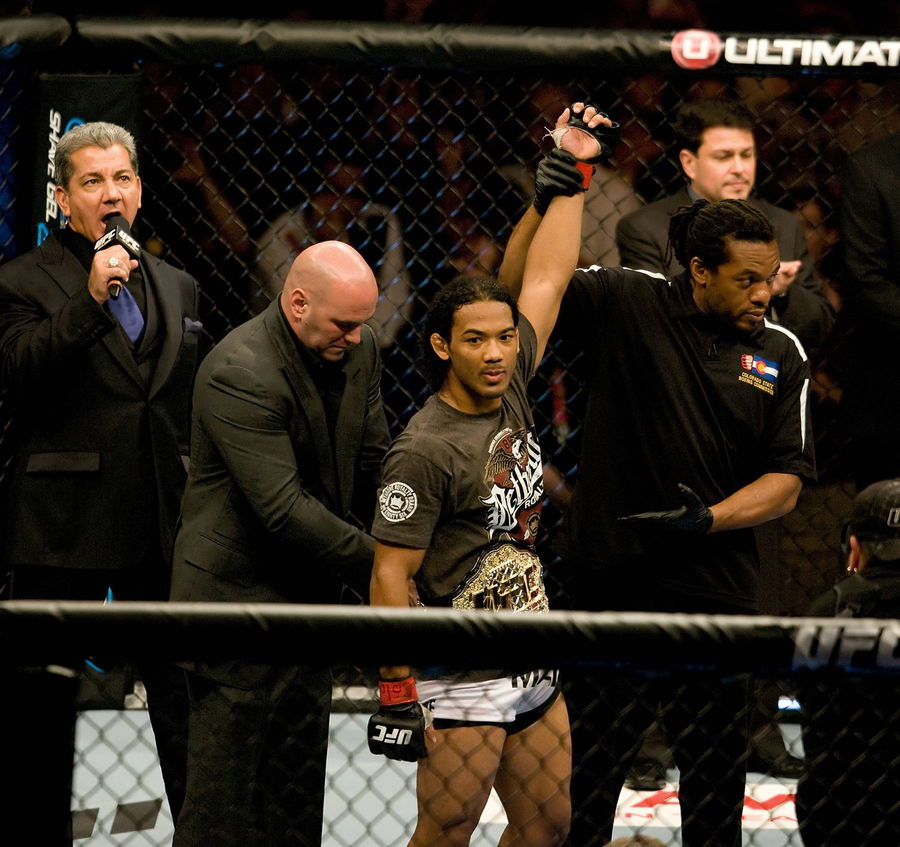 Aug. 11, 2012 – Denver, CO, USA – BENSON HENDERSON, center, gets his arm raised in victory during UFC 150 at the Pepsi Center in Denver CO Saturday night. UFC 2012 – UFC 150 in Denver CO – ZUMAav4