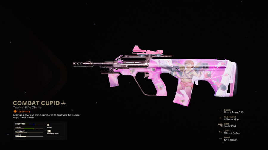 The Top Secret Admirer AUG, dubbed the Combat Cupid also has a powerful case for medium range loadout in the game. The Combat Cupid also uses the Millstop reflex for the optic with a 5.56 Muzzle Brake and the Infiltrator Grip as the underbarrel. It also uses the 17″ Titanium barrel and the raider pad for the stock.