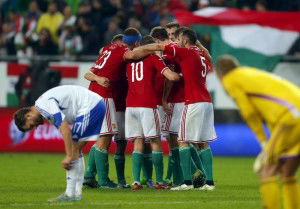 Hungary’s players celebtate their victory against Faroe Islands in their Euro 2016 qualifying soccer match in Budapest, Hungary October 8, 2015. REUTERS/Laszlo Balogh