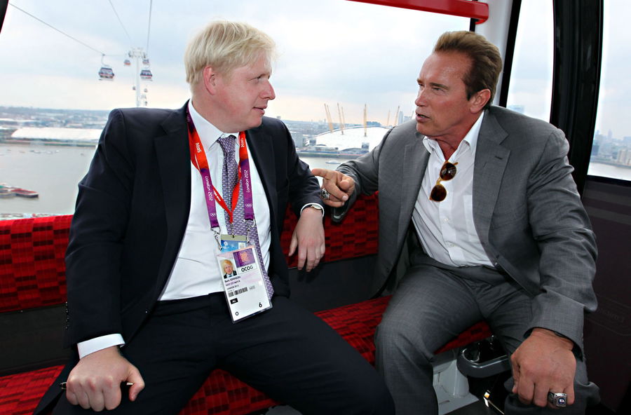 LONDON – AUGUST 12: Mayor of London Boris Johnson and Arnold Schwarzenegger take a ride on the Emirates cable car from Greenwich to the ExCeL in Docklands, after watching the Olympic basketball in Greenwich , on August 12, 2012 in London, England. (Photo by Sean Dempsey – WPA Pool/Getty Images)