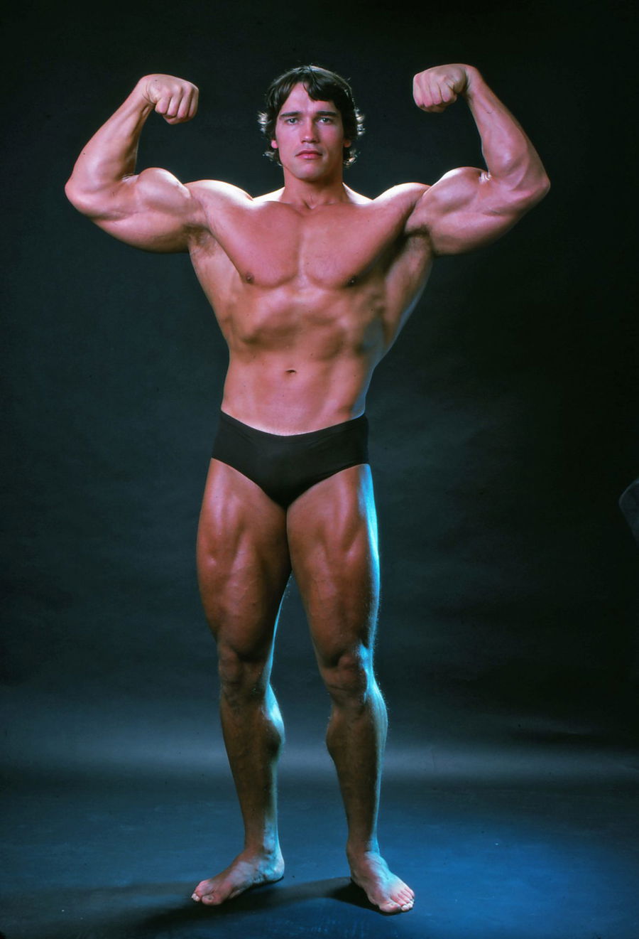 Professional bodybuilder Arnold Schwarzenegger posing at the top of his form in October 1976. (Photo by Jack Mitchell/Getty Images)