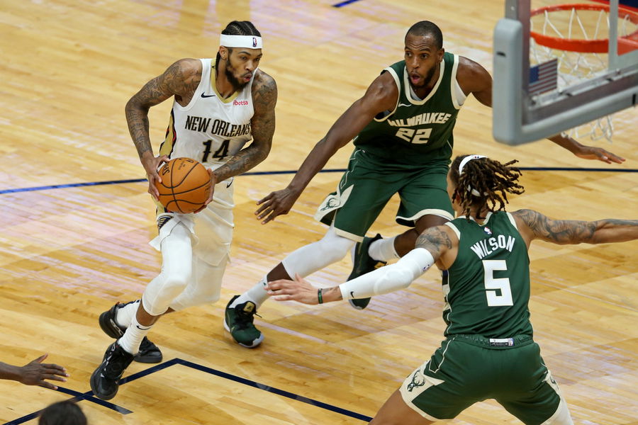 Dec 18, 2020; New Orleans, Louisiana, USA; New Orleans Pelicans forward Brandon Ingram (14) drives while defended by Milwaukee Bucks forwards Khris Middleton (22) and D.J. Wilson (5) in the second quarter at the Smoothie King Center. Mandatory Credit: Chuck Cook-USA TODAY Sports