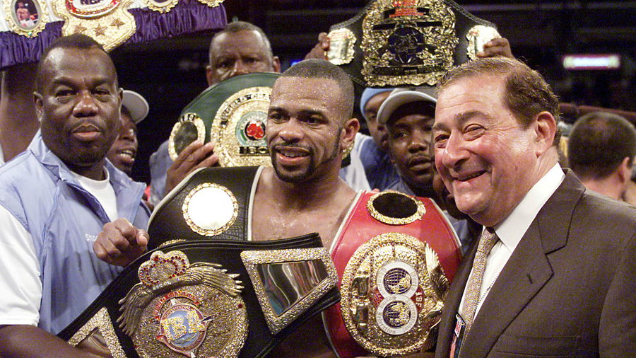 LAS VEGAS – NOVEMBER 18,1994: Roy Jones Jr. celebrates winning the fight against James Toney at the MGM Grand in Las Vegas, Nevada. Roy Jones Jr.won the IBF super middleweight title by a UD 12 (Photo by: The Ring Magazine via Getty Images)