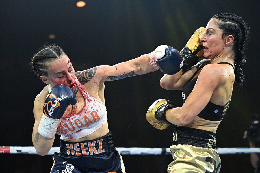 Cherneka Johnson of New Zealand fights Susie Ramadan of Australia during their IBF super-bantamweight boxing world title bout in Melbourne on October 16, 2022. (Photo by William WEST / AFP) / — IMAGE RESTRICTED TO EDITORIAL USE – STRICTLY NO COMMERCIAL USE — (Photo by WILLIAM WEST/AFP via Getty Images)