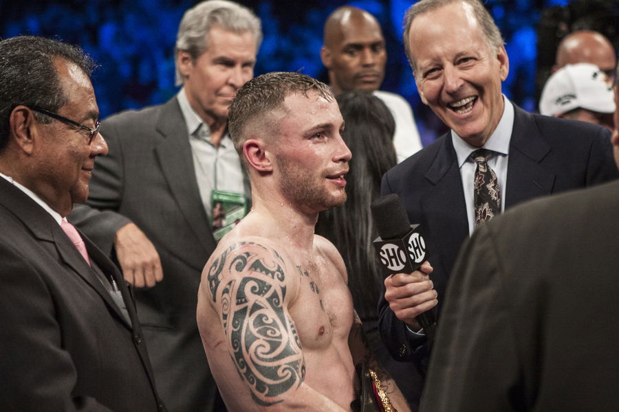 BROOKLYN, NY – July 30: MANDATORY CREDIT Bill Tompkins/Getty Images Carl Frampton defeats Leo Santa Cruz in their Featherweight Cahmpionship fight at the Barclay Center on July 30, 2016 in Brooklyn. Frampton gives a post fight interview. (Photo by Bill Tompkins/Getty Images)