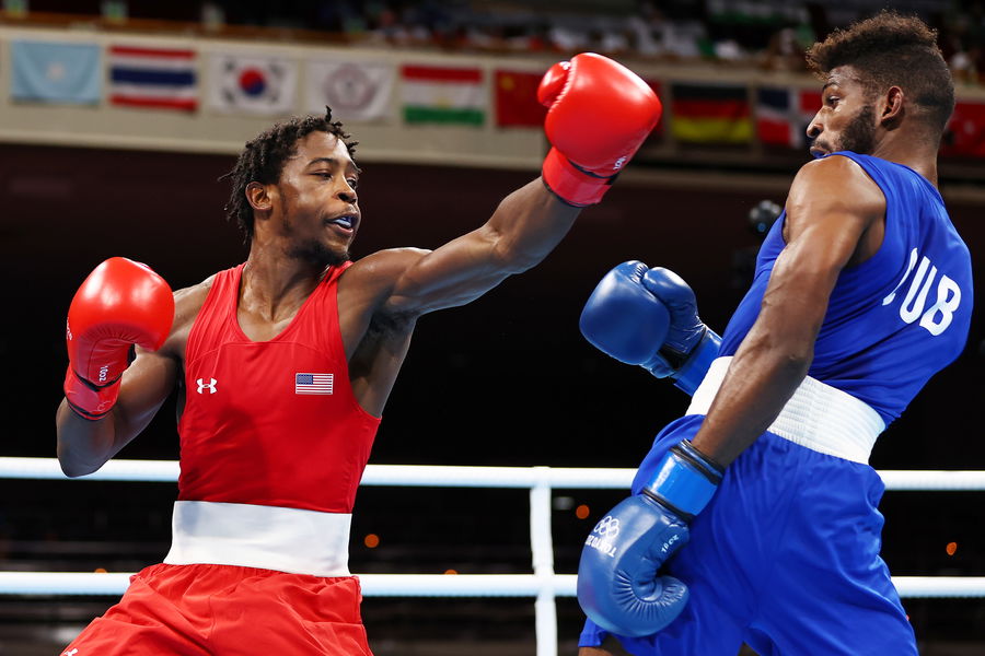 TOKYO, JAPAN – AUGUST 08: Andy Cruz of Team Cuba dodges a punch from Keyshawn Davis of Team United States during the Men’s Light (57-63kg) Final bout between Keyshawn Davis of Team United States and Andy Cruz of Team Cuba on day sixteen of the Tokyo 2020 Olympic games at Kokugikan Arena on August 08, 2021 in Tokyo, Japan. (Photo by Buda Mendes/Getty Images)