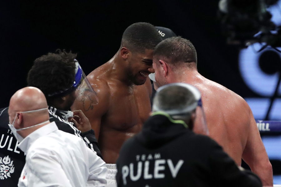 Boxing – Heavyweight World Title Fight – Anthony Joshua v Kubrat Pulev – The SSE Arena, London, Britain – December 12, 2020 Anthony Joshua and Kubrat Pulev react after the fight Pool via REUTERS/Andrew Couldridge