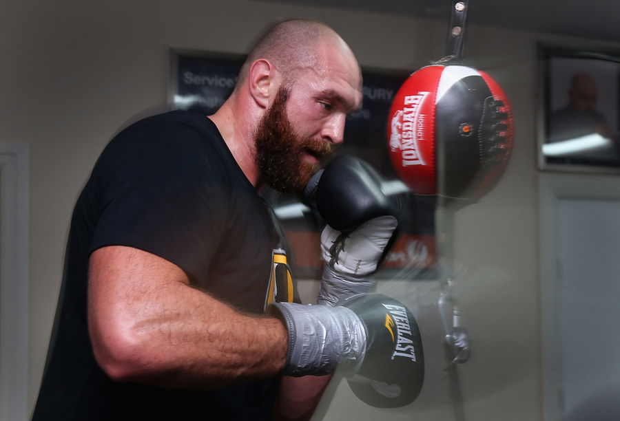 BOLTON, ENGLAND – NOVEMBER 06: Tyson Fury works on a speedball during a training session at Team Fury Gym ahead of his fight with Dereck Chisora on November 6, 2014 in Bolton, England. (Photo by Alex Livesey/Getty Images)