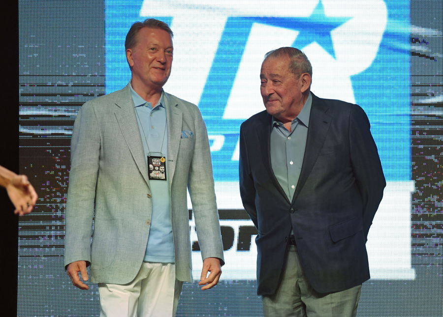 LAS VEGAS, NEVADA – JUNE 14: Boxing promoter Frank Warren (L) and Top Rank Founder and CEO Bob Arum attend the ceremonial weigh-in for the Tyson Fury and Tom Schwarz fight at MGM Grand Garden Arena on June 14, 2019 in Las Vegas, Nevada. Fury and Schwarz will meet in a heavyweight bout on June 15 at MGM Grand Garden Arena in Las Vegas. (Photo by Ethan Miller/Getty Images)