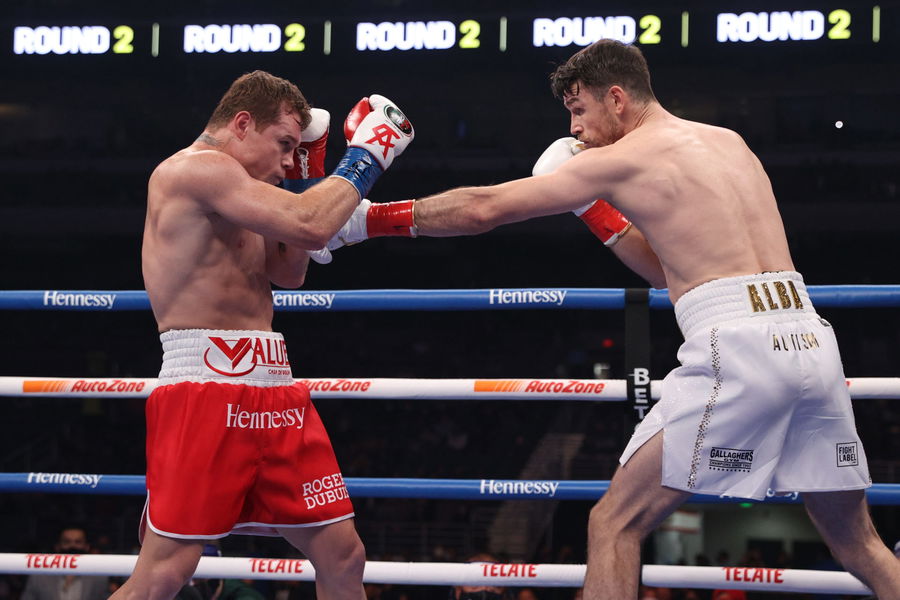 Dec 19, 2020; San Antonio, TX, USA; Canelo Alvarez (red trunks) and Callum Smith (white trunks) during their WBA, WBC and Ring Magazine super middleweight championship bout at the Alamodome in San Antonio, TX. Mandatory Credit: Ed Mulholland/Handout Photo via USA TODAY Sports