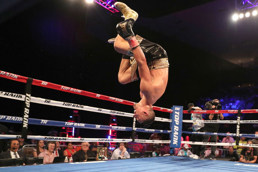 NEW ORLEANS, LA – JULY 14: Teofimo Lopez backflips into the air after beating William Silva during their WBC Continental Americas Title boxing match at the UNO Lakefront Arena on July 14, 2018 in New Orleans, Louisiana. (Photo by Alex Menendez/Getty Images)