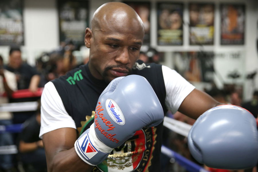 LAS VEGAS, NV – APRIL 14: WBC/WBA welterweight champion Floyd Mayweather Jr. loosens up before he works out at the Mayweather Boxing Club on April 14, 2015 in Las Vegas, Nevada. Mayweather will face WBO welterweight champion Manny Pacquiao in a unification bout on May 2, 2015 in Las Vegas. (Photo by Alex Menendez/Getty Images)