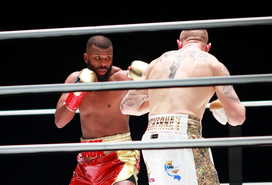 Nov 28, 2020; Los Angeles, CA, USA; Badou Jack (red trunks) fights Blake McKernan (white trunks) during a light heavyweight boxing bout at the Staples Center. Mandatory Credit: Joe Scarnici/Handout Photo via USA TODAY Sports