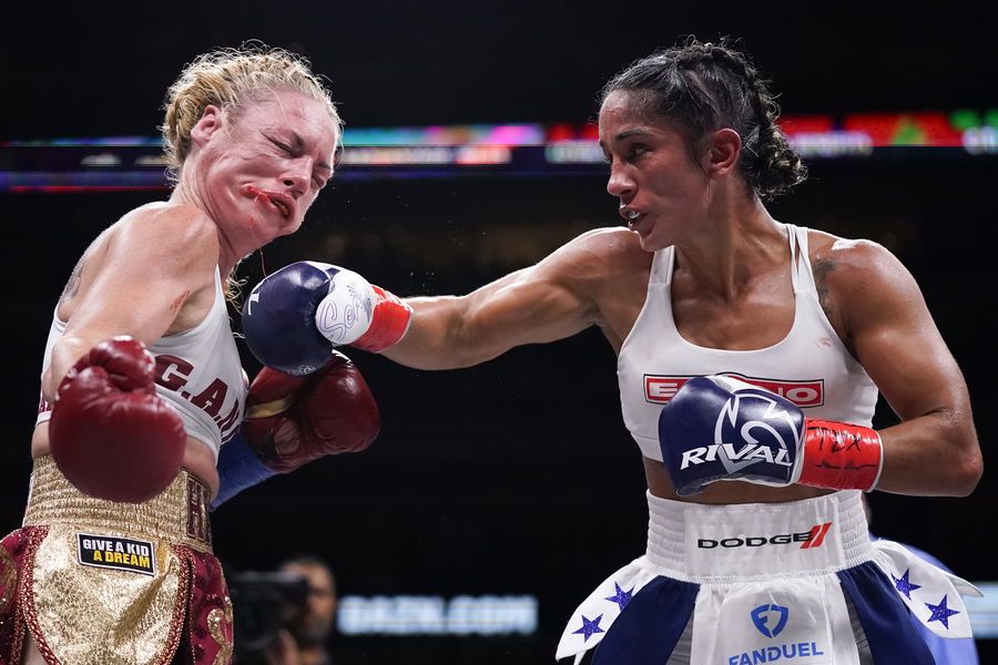 DALLAS, TEXAS – AUGUST 05: Amanda Serrano hits Heather Hardy with a right during the seventh round of their fight at the American Airlines Center on August 05, 2023 in Dallas, Texas. (Photo by Sam Hodde/Getty Images)