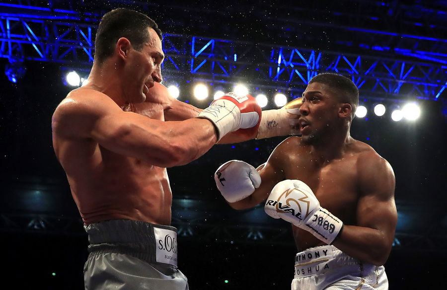 LONDON, ENGLAND – APRIL 29: Anthony Joshua (White Shorts) and Wladimir Klitschko (Gray Shorts) in action during the IBF, WBA and IBO Heavyweight World Title bout at Wembley Stadium on April 29, 2017 in London, England. (Photo by Richard Heathcote/Getty Images)