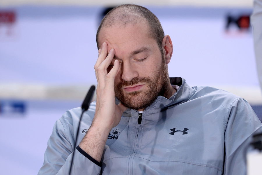 COLOGNE, GERMANY – APRIL 28: Tyson Fury reacts as Wladimir Klitschko speaks to the media during Tyson Fury and Wladimir Klitschko head to head press conference on April 28, 2016 in Cologne, Germany. Fury v Klitschko Part 2 will take place in Manchester on July 9 for the WBO, WBA and IBO heavyweight belts. (Photo by Sascha Steinbach/Bongarts/Getty Images)