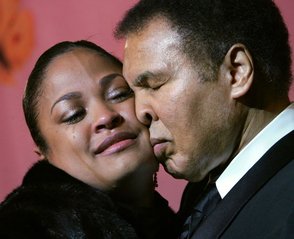 WBC and WIBA super middleweight champion Laila Ali is kissed by her father, boxing great Muhammad Ali. MCI Center in Washington in this June 11, 2005 file photo.
