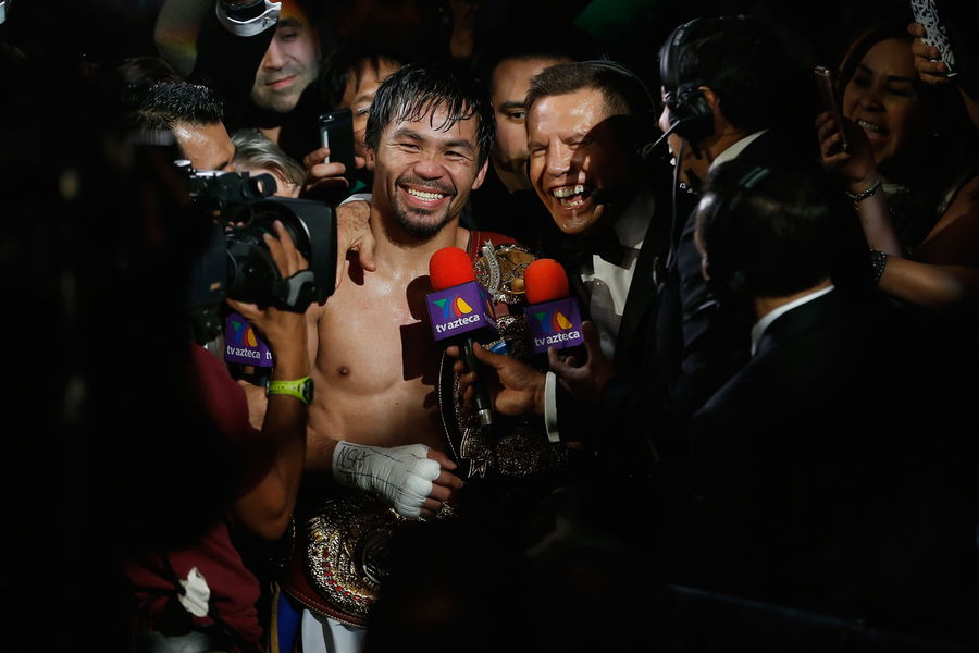 LAS VEGAS, NEVADA – APRIL 09: Manny Pacquiao is interviewed after defeating Timothy Bradley Jr. by unanimous decision in their welterweight championship fight on April 9, 2016 at MGM Grand Garden Arena in Las Vegas, Nevada. (Photo by Christian Petersen/Getty Images)