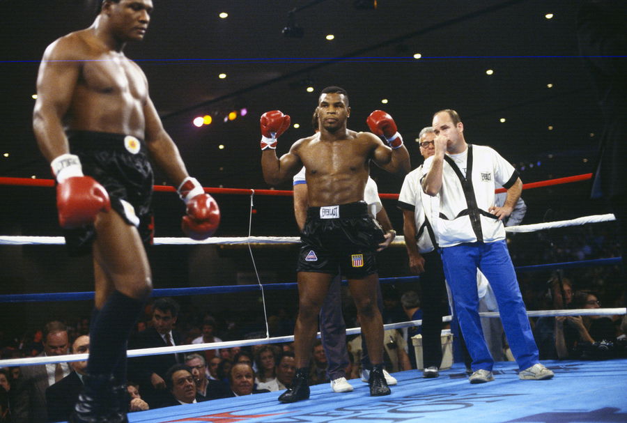 LAS VEGAS – NOVEMBER 22: Mike Tyson, right, and Trevor Berbick, in the ring before the start of their scheduledWBC heavyweight title fight. The Hilton Hotel in Las Vegas, Nevada. Tyson won the fight by TKO in the second round. (Photo by Focus on Sport/Getty Images)