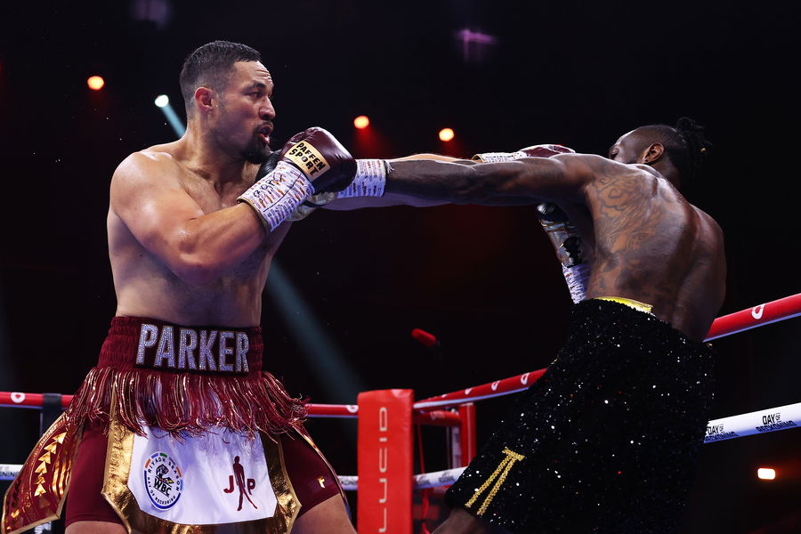 RIYADH, SAUDI ARABIA – DECEMBER 23: Deontay Wilder and Joseph Parker exchange punches during the WBC International & WBO Intercontinental Heavyweight title fight between Deontay Wilder and Joseph Parker during the Day of Reckoning: Fight Night at Kingdom Arena on December 23, 2023 in Riyadh, Saudi Arabia. (Photo by Richard Pelham/Getty Images)