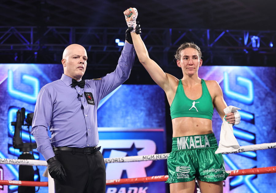 LAS VEGAS, NEVADA – OCTOBER 31: Mikaela Mayer celebrates defeating Ewa Brodnicka (not pictured) in their Jr. Lightweight title bout at MGM Grand Conference Center on October 31, 2020 in Las Vegas, Nevada. (Photo by Mikey Williams/Top Rank Inc via Getty Images)