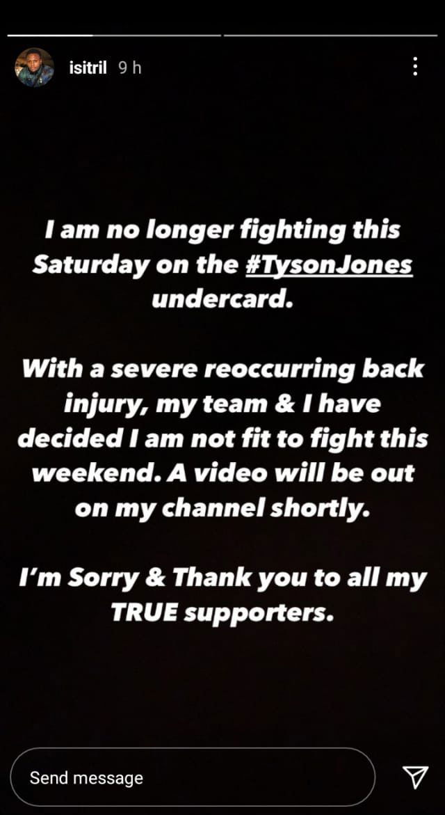 Riley said, “I am no longer fighting this Saturday on the #TysonJones undercard. With a severe reoccurring back injury, my team and I have decided I am not fit to fight this weekend. A video will be out on my channel shortly. I’m Sorry & Thank you to all my TRUE supporters.”