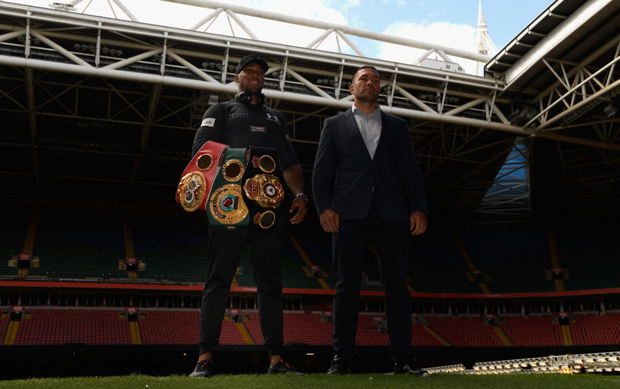 CARDIFF, WALES – SEPTEMBER 11: Anthony Joshua (l) and Kubrat Pulev pictured during a media opportunity ahead of their World Heavyweight title clash at Principality Stadium on September 11, 2017 in Cardiff, Wales. (Photo by Stu Forster/Getty Images)