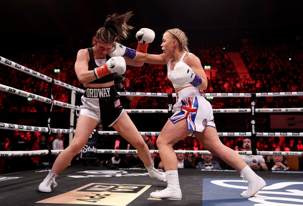 LONDON, ENGLAND – JANUARY 14: Faith Ordway is punched by Elle Brooke during the Light Heavyweight fight between Elle Brooke and Faith Ordway at OVO Arena Wembley on January 14, 2023 in London, England. (Photo by Julian Finney/Getty Images)