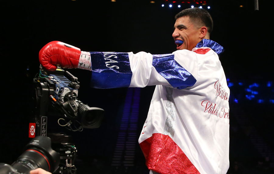LAS VEGAS, NV – DECEMBER 13: Victor Ortiz celebrates his 3rd round TKO win over Manuel Perez (not shown) at the MGM Grand Garden Arena on December 13, 2014 in Las Vegas, Nevada. (Photo by Ed Mulholland/Golden Boy/Golden Boy via Getty Images)